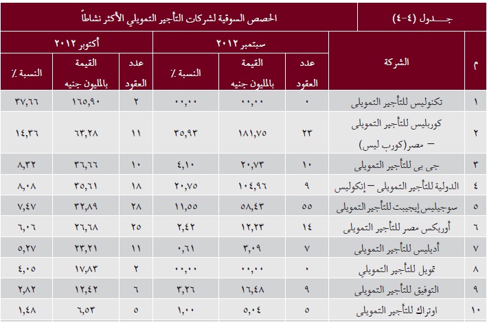 فيما احتلت شركة كوربليس المركز الثانى فى القائمة بحصة بلغت 14.3 % وحققت عقود بقيمة 63.2 مليون جنيه , وتلتها فى القائمة شركة جى بى للتاجير التمويلى بحصة 8.3 % وحجم عقود تجاوز 36.6 مليون جنيه .