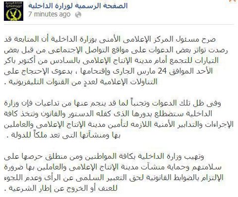 وقالت وزارة الداخلية انها تهيب بكافة المواطنين ومن منطلق حرصها على سلامتهم وحماية منشآت مدينة الإنتاج الإعلامى والعاملين بها ضرورة الإلتزام بالضوابط القانونية لحق التعبير السلمى عن الرأى وعدم اللجوء للعنف أو الخروج عن إطار الشرعية