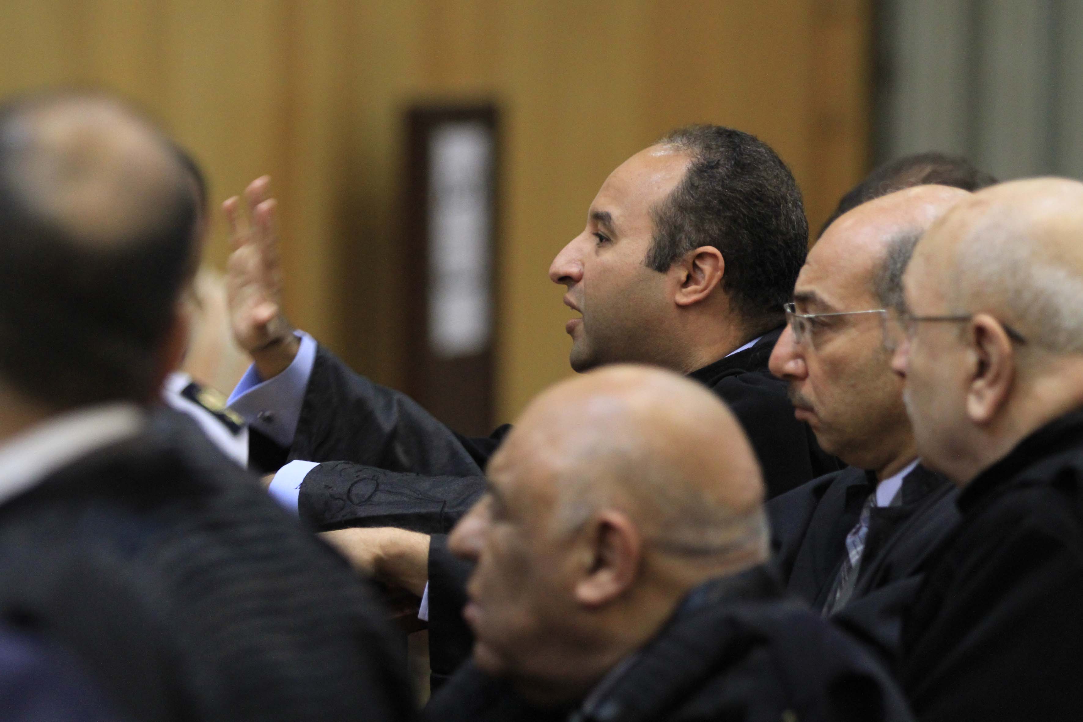 قضية التلاعب بالبورصة المتهم فيها علاء وجمال مبارك واخرين ومناقشات حادة بين محاميين المتهمين والشاهد الاول للقضية