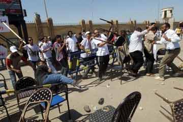 شهد محيط البوابة رقم (8) لأكاديمية الشرطة مناوشات بين أنصار الرئيس السابق محمد حسنى مبارك وأسر الشهداء الذين تجمعوا منذ الصباح الباكر على يمين ويسار البوابة أثناء نظر الجلسة الثالثة من جلسات إعادة محاكمة الرئيس السابق ونجليه ووزير الداخلية الأسبق حبيب العادلى ومساعديه الستة.