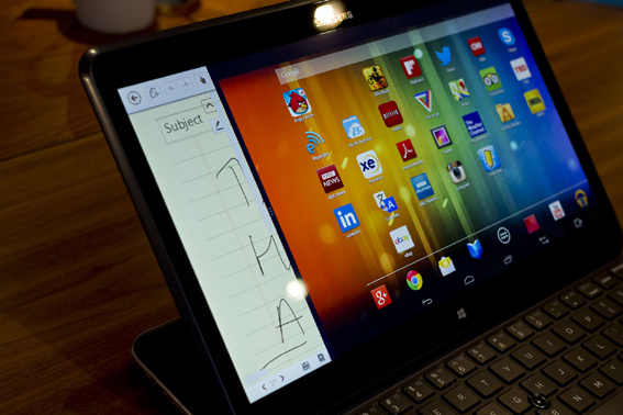 وكشفت “سامسونج” النقاب عن “أتيف Q” الذي يمكن أن يتغير شكله من حاسب لوحي إلي حاسب محمول، ويعمل بنظامي التشغيل “أندرويد” و “ويندوز8″، ويحمل شاشة بحجم 13.3 بوصة.
