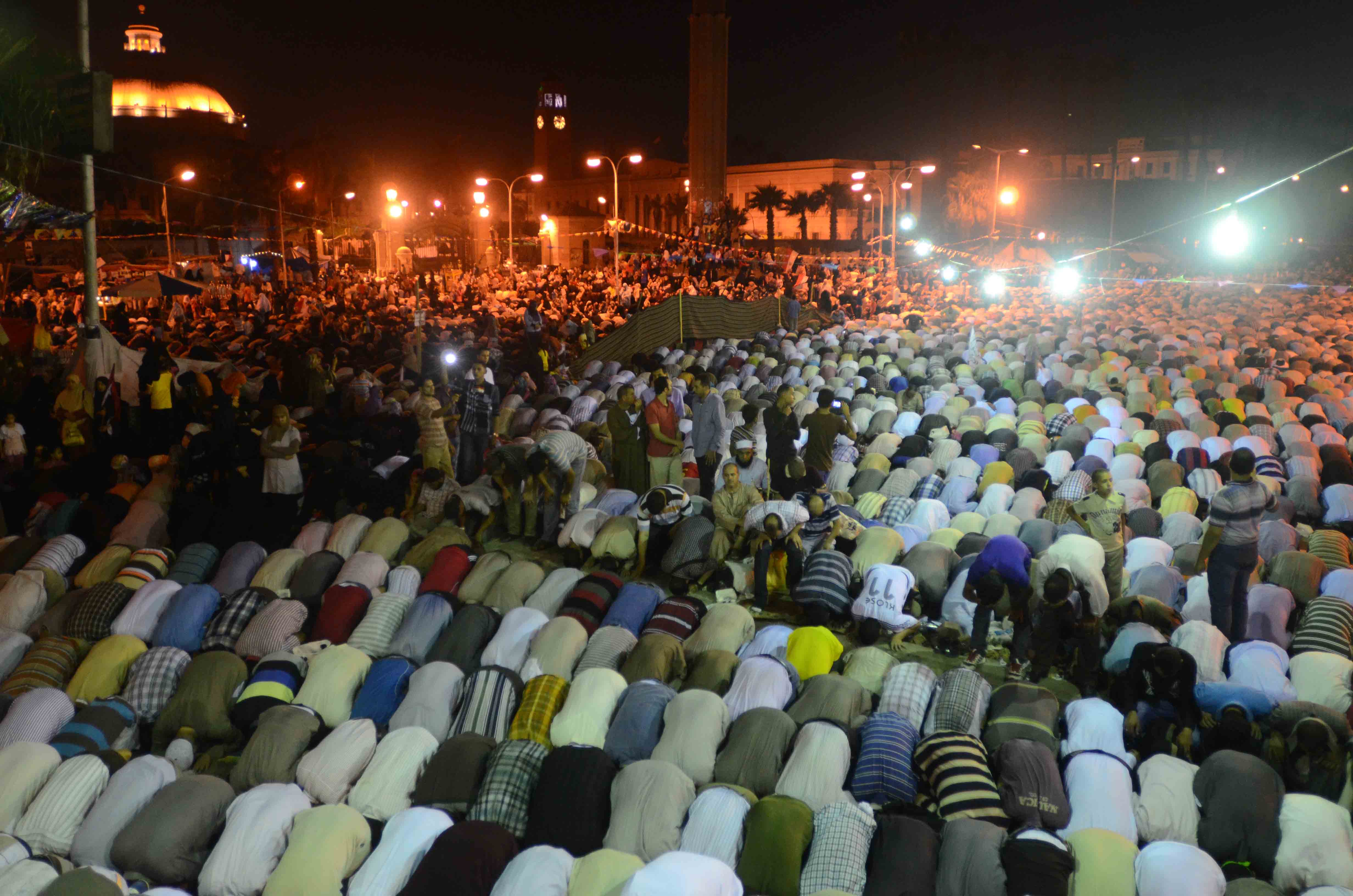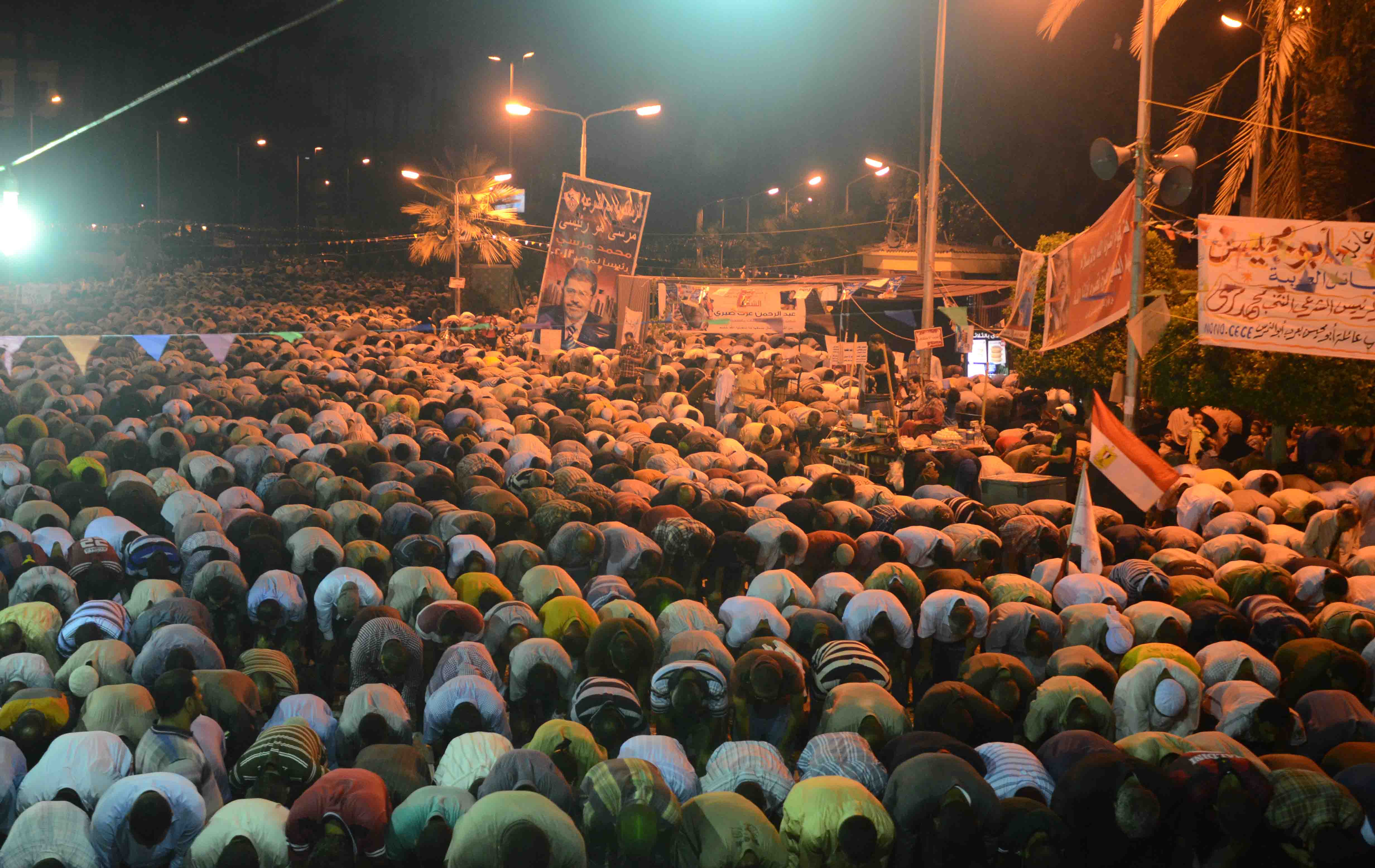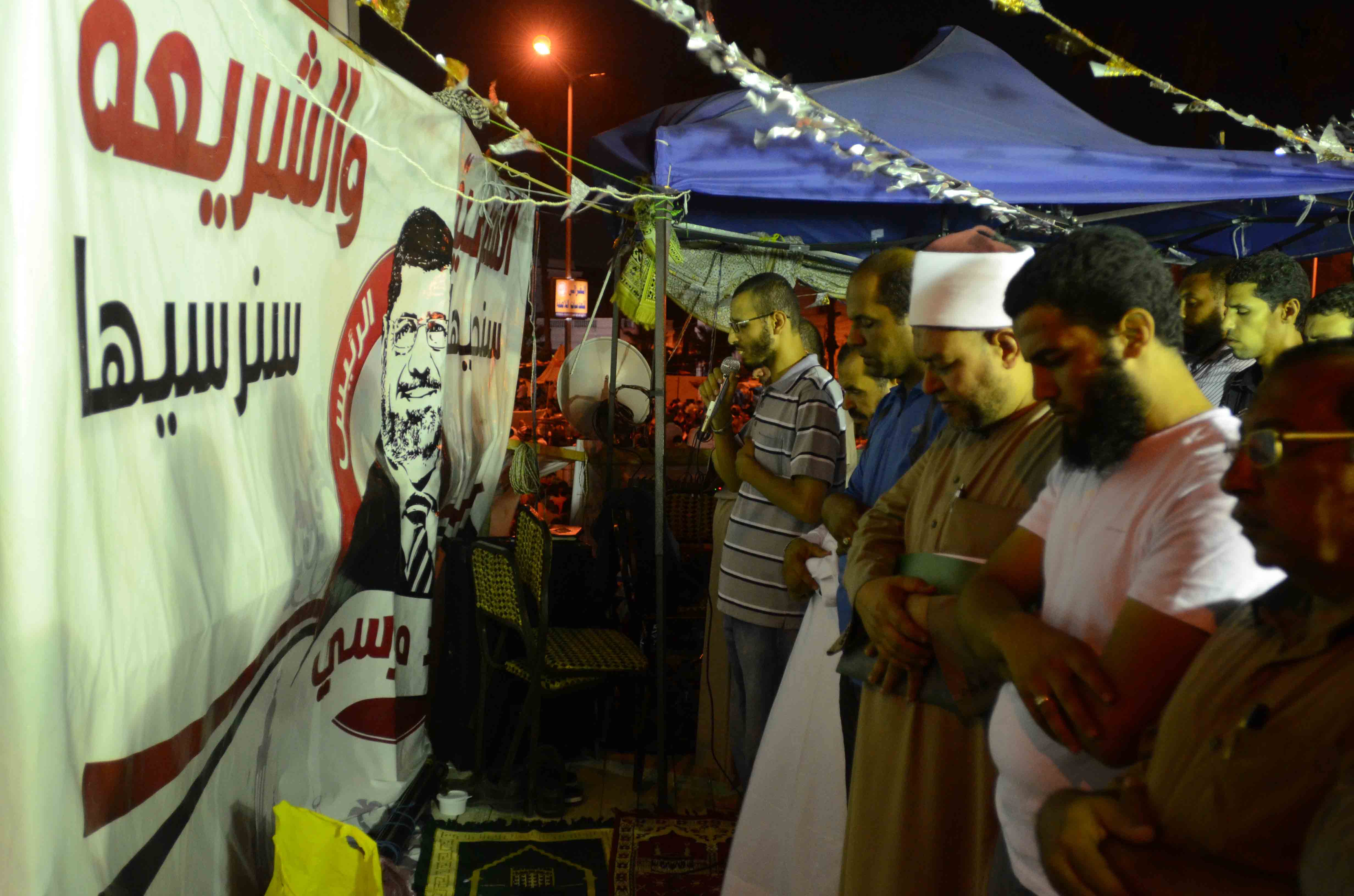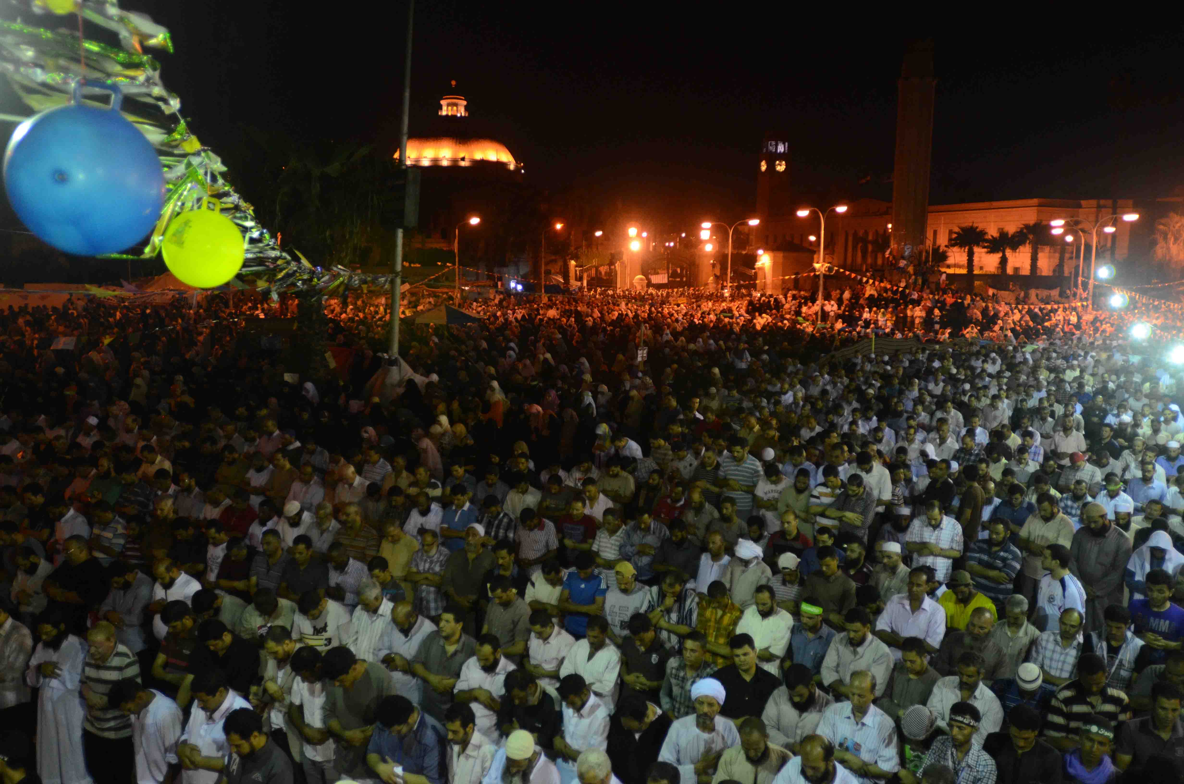 مؤيدى مرسى يصلون العشاء والقيام امام جامعة القاهرة