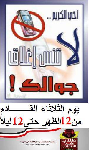 يوم الثلاثـــــاء الموافق ( 24/9/2013) ان شاء الله وعلي مدار اليوم هنقفل الموبايل من الساعه ١٢ مساء( الظهر) للساعه ١٢ ( بالليل ) نرجو من الجميع المشاركه معنــــــــــــــا …