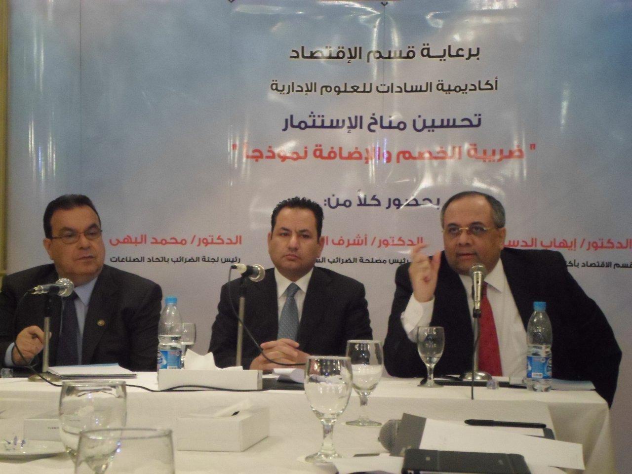تحت رعاية قسم الإقتصاد بأكاديمية السادات للعلوم الإدارية ،عقدت حلقة نقاشية حول التعديلات الضريبية الجديدة (نموذج ضريبة الخصم والإضافة) ومدى تأثيرها على المناخ الإستثمارى والإقتصاد المصري ككل،بحضور الدكتور إيهاب الدسوقى رئيس قسم الإقتصاد بأكاديمية السادات للعلوم الإدارية،والسيد محمد البهى رئيس لجنة الضرائب باتحاد الصناعات المصرية والسيد أشرف العربى رئيس مصلحة الضرائب السابق.