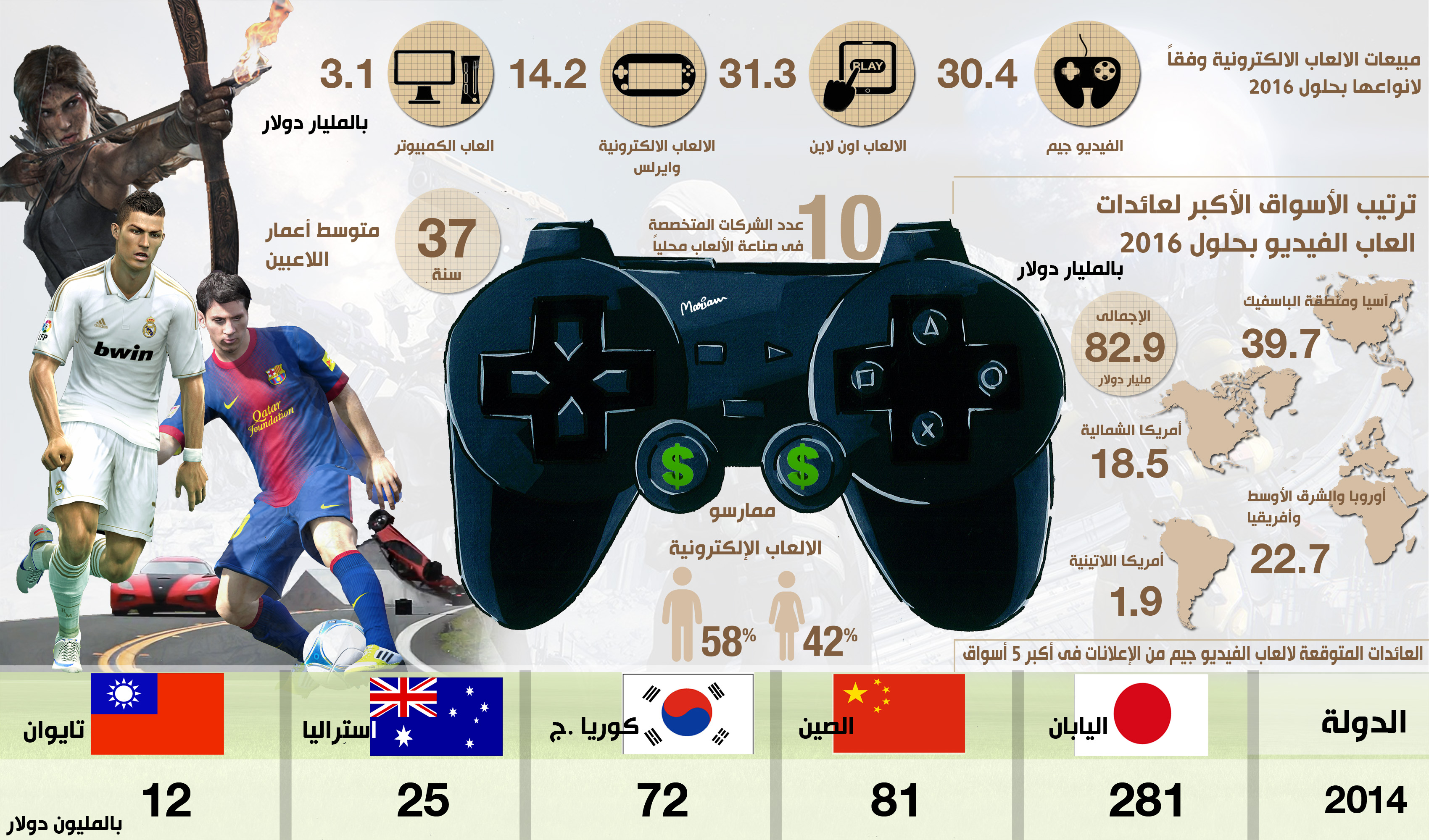 قال تقرير صادر عن برايس ووتر هاوس ان مبيعات الالعاب الالكترونية عبر الكمبيوتر ستصل الى 3.1 مليار دولار بحلول عام 2016 فيما ستصل مبيعات الفيديو جيك نحو 30.4 مليار دولار . وفيما يلى انفوجراف عن الالعاب الالكترونية . [caption id="attachment_523526" align="alignnone" width="300"]<a href="http://www.alborsanews.com/2014/02/18/%d8%a7%d9%86%d9%81%d9%88%d8%ac%d8%b1%d8%a7%d9%81-%d9%85%d8%a8%d9%8a%d8%b9%d8%a7%d8%aa-%d8%a7%d9%84%d8%a7%d9%84%d8%b9%d8%a7%d8%a8-%d8%a7%d9%84%d8%a7%d9%84%d9%83%d8%aa%d8%b1%d9%88%d9%86%d9%8a%d8%a9/smart/" rel="attachment wp-att-523526"><img class="size-medium wp-image-523526" alt="انفوجراف :مبيعات الالعاب الالكترونية..واكبر الاسواق لعائدات العاب الفيديو" src="http://www.alborsanews.com/beta/wp-content/uploads/2014/02/smart--300x176.jpg" width="300" height="176" /></a> انفوجراف :مبيعات الالعاب الالكترونية..واكبر الاسواق لعائدات العاب الفيديو[/caption]