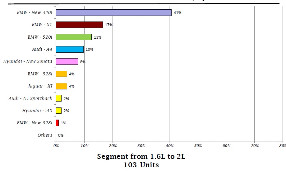 تصدر طراز bmw 320 i قائمة اعلى السيارات مبيعا سعة 2000 سى سى فى مصر خلال يناير الماضى بحصة بلغت 41 % , وتلتها فى القائمة bmw x1 بحصة 17 % , وفى المركز الثالث حلت bmw 520i بحصة 13 % , وبذلك احتلت طرازات بى ام دبليو المراكز الثلاثة الاولى فى مصر فى هذه الفئة .
