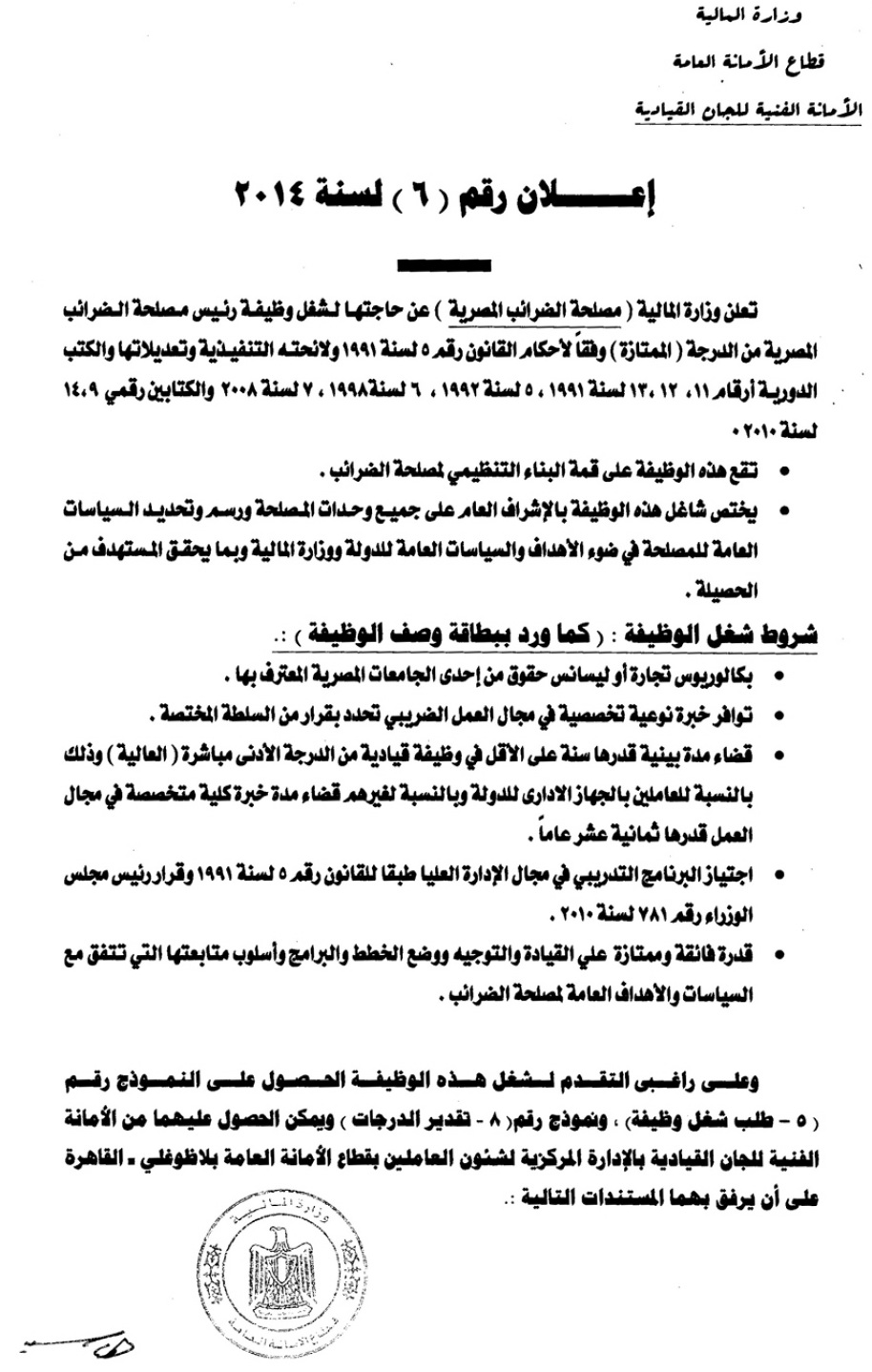 اعلنت وزارة المالية عن حاجتها لوظيفة رئيس مصلحة الضرائب عبر موقعها الالكترونى .