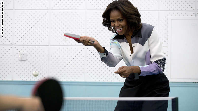 أوباما تلعب بكرة الطاولة “البينغ بونغ” خلال زيارتها إلى أحد المدارس حيث تهدف بالأساس إلى التبادل الثقافي والتعليمي.