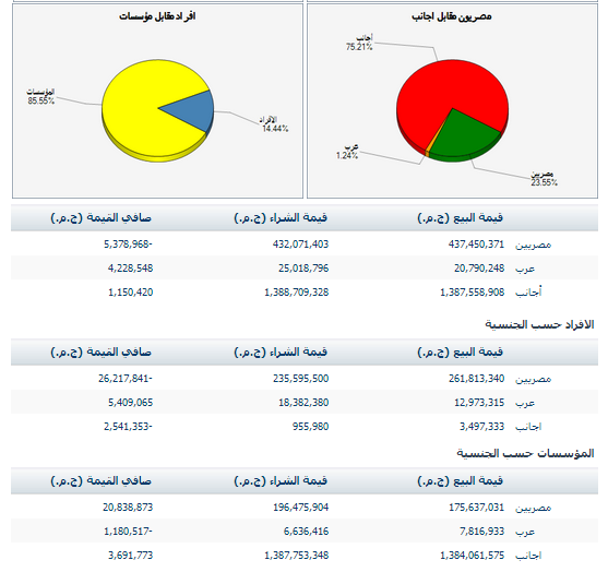 و اتجه صافى تعاملات المصريين نحو البيع مسجلا 5.37 مليون جنيه، و بنسبة استحواذ 23.55%، بينما اتجه صافى تعاملات العرب و الاجانب نحو الشراء مسجلين 4.22 مليون جنيه، 1.15 مليون جنيه على التوالى، و بنسبة استحواذ 75.21% ، 1.24% من قيم التداولات .