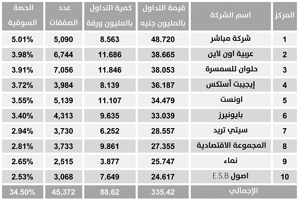 جاء فى المركز الثانى عربية أون لاين بـ 38 مليون جنيه مسجلة حصة سوقية %3.98، قبل حلوان التى حققت تداولات 36 مليون جنيه وحصة سوقية %3.91.
