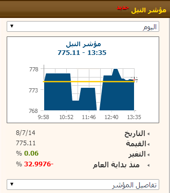 سجل مؤشر النيل لدى نهاية تعاملات جلسة اليوم ارتفاعا نسبته 0.06 % مغلقا عند مستوى 775.11 نقطة.