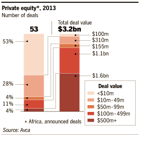 وبلغ اجمالى عمليات الاندماج والاستحواذ الافريقية العام الماضى 30 مليار دولار بموجب ألف صفقة، ويستهدف الان أكثر من 220 مديرا من مدراء الشركات التى تتعامل فى الأسهم الخاصة أفريقيا، وقالت جمعية رأس المال المخاطر الافريقية ان 53 صفقة للأسهم الخاصة تم انجازها العام الماضى بلغت قيمتها 3.2 مليار دولار ولكنها مازالت أقل من قيمة صفقات الاسهم الخاصة التى تمت فى عام 2007 وبلغت قيمتها 4.7 مليار دولار.