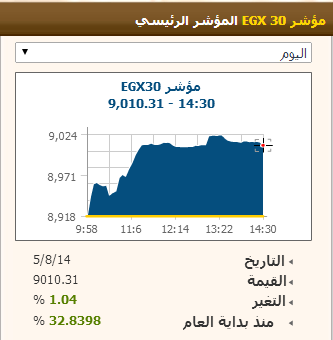 ارتفع المؤشر الرئيسى للبورصة المصرية EGX30 بنسبة 1.04% بنهاية تعاملات جلسة اليوم الثلاثاء ليغلق عند مستوى 9010.31 نقطة، كما راتفع مؤشر EGX70 للأسهم المتوسطة بنسبة 0.18% مغلقا عند مستوى 628.22 نقطة، و ارتفع مؤشر EGX100 الاوسع نطاقا بنسبة 0.81% ليستقر عند مستوى 1115.17 نقطة .