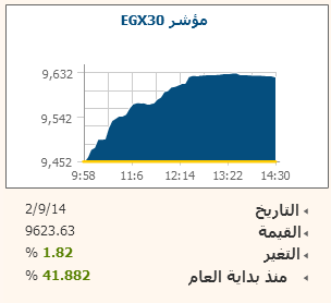 ارتفع المؤشر الرئيسى للبورصة المصرية EGX30 بنسبة 1.82% بنهاية تعاملات جلسة اليوم الثلاثاء ليغلق عند مستوى 9623.63 نقطة، و صعد مؤشر EGX70 للأسهم المتوسطة بنسبة 0.43% مغلقا عند مستوى 669.84 نقطة، كما ارتفع مؤشر EGX100 الأوسع نطاقا بنسبة 1.01% ليستقر عند مستوى 1189.14 نقطة فى ختام التعاملات .