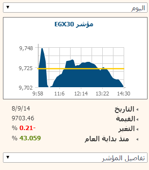 تراجع المؤشر الرئيسى للبورصة المصرية EGX30 بنسبة 0.21% بنهاية تعاملات جلسة اليوم الإثنين ليغلق عند مستوى 9703.46 نقطة، و هبط مؤشر EGX70 للأسهم المتوسطة بنسبة 1.42%، كما تراجع مؤشر EGX100 الأوسع نطاقا بنسبة 0.82% ليستقر عند مستوى 1171.47 نقطة.