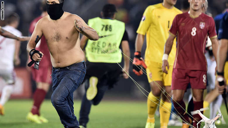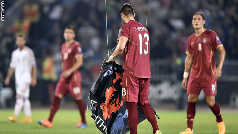 دفعت التوترات العرقية واستخدام طائرة بدون طيار الحكم الإنجليزي، مارتن اتكينسون، إلى إلغاء المباراة بين صربيا وضيفتها ألبانيا في تصفيات بطولة أوروبا لكرة القدم 2016 قبل اكتمال شوطها الأول، وذلك بعد اشتباكات بين لاعبين من الفريقين.