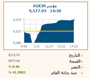 ارتفع المؤشر الرئيسى للبورصة المصرية EGX30 بنسبة 0.46% بنهاية جلسة اليوم الاثنين، ليصل الى مستوى 9577.93 نقطة، وصعد مؤشر EGX70 للأسهم المتوسطة ليصل الى مستوى 637.43 نقطة، كما ارتفع مؤشر EGX100 الأوسع نطاقا بنسبة 0.38% ليصل لمستوى 1161.91 نقطة .
