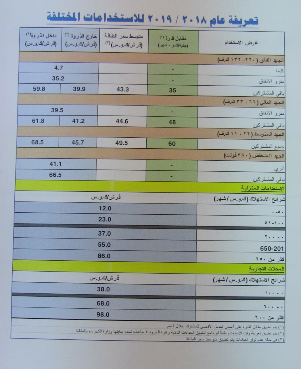 وأوضح المتحدث، أنه وفقًا لهذه التعريفة الجديدة فإن شرائح الاستخدام المنزلي في عام ‏‏2014/2015 من 51 إلى 100 كيلووات أصبحت بسعر 5ر14 قرشًا تزيد تدريجيًا إلى 17 ‏ثم 19 ثم 21 ثم 23 قرشا على مدى 5 سنوات، ثم الشريحة من صفر إلى 200 كيلووات ‏بسعر 16 قرشا تزيد تدريجيًا إلى 20 ثم 26 ثم 31 ثم 37 قرشًا، ثم الشريحة من 201 إلى ‏‏350 كيلووات بسعر 24 قرشا تزيد بالتدريج إلى 29 ثم 35 ثم 45 قرشا لتكون الشريحة من ‏‏201 إلى 650 كيلووات في عام 2018/2019 بسعر 55 قرشا، ثم الشريحة من 351 إلى ‏‏650 كيلووات بسعر 34 قرشا ثم 39 ثم 44 ثم 50 قرشا في 2017 /2018، ثم الشريحة من ‏‏561 إلى 1000 كيلوات بسعر 60 قرشًا في 2014/2015 ثم 68 ثم 71 ثم 76 قرشا في ‏عام 2017/2018، ثم أكثر من 1000 كيووات في عام 2014/2015 بسعر 74 قرشا ثم ‏‏78 ثم 81 ثم 86 قرشا في عام 2017/2018 وفي عام 2018/2019 ستكون الشريحة أكثر ‏من 650 كيلوات بـ 86 قرشًا.‏