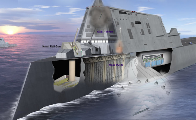 1. Megajoule Electromagnetic Railgun : سلاح بحري يستخدم الطاقة الكهرومغناطيسية لرمي القذائف على بعد 5000 ميل ، ويمكن لهذا السلاح العمل دون الحاجة للجنود ، وتعتمد فكرة السلاح على توليد الطاقة الكهرومغناطيسية ذات الجهد العالي من المكثفات الموجودة بداخله ، والتي تولد الطاقة الكهربائية ، وهي فكرة تشابة فكرة الأسلحة النووية ، وتجري البحرية الأمريكية الاختبارات على هذا السلاح الجديد ليخرج للنور بحلول 2017 .