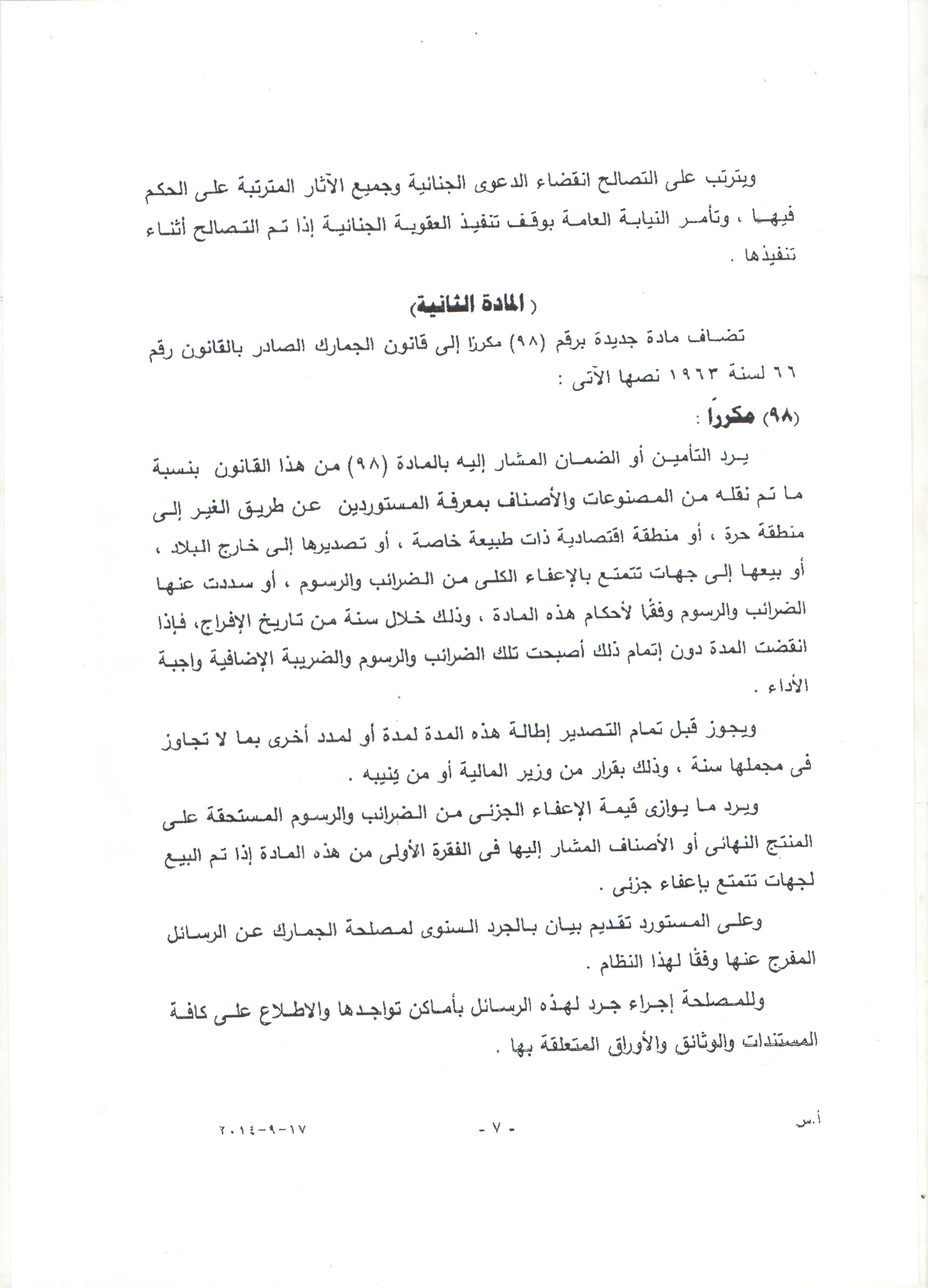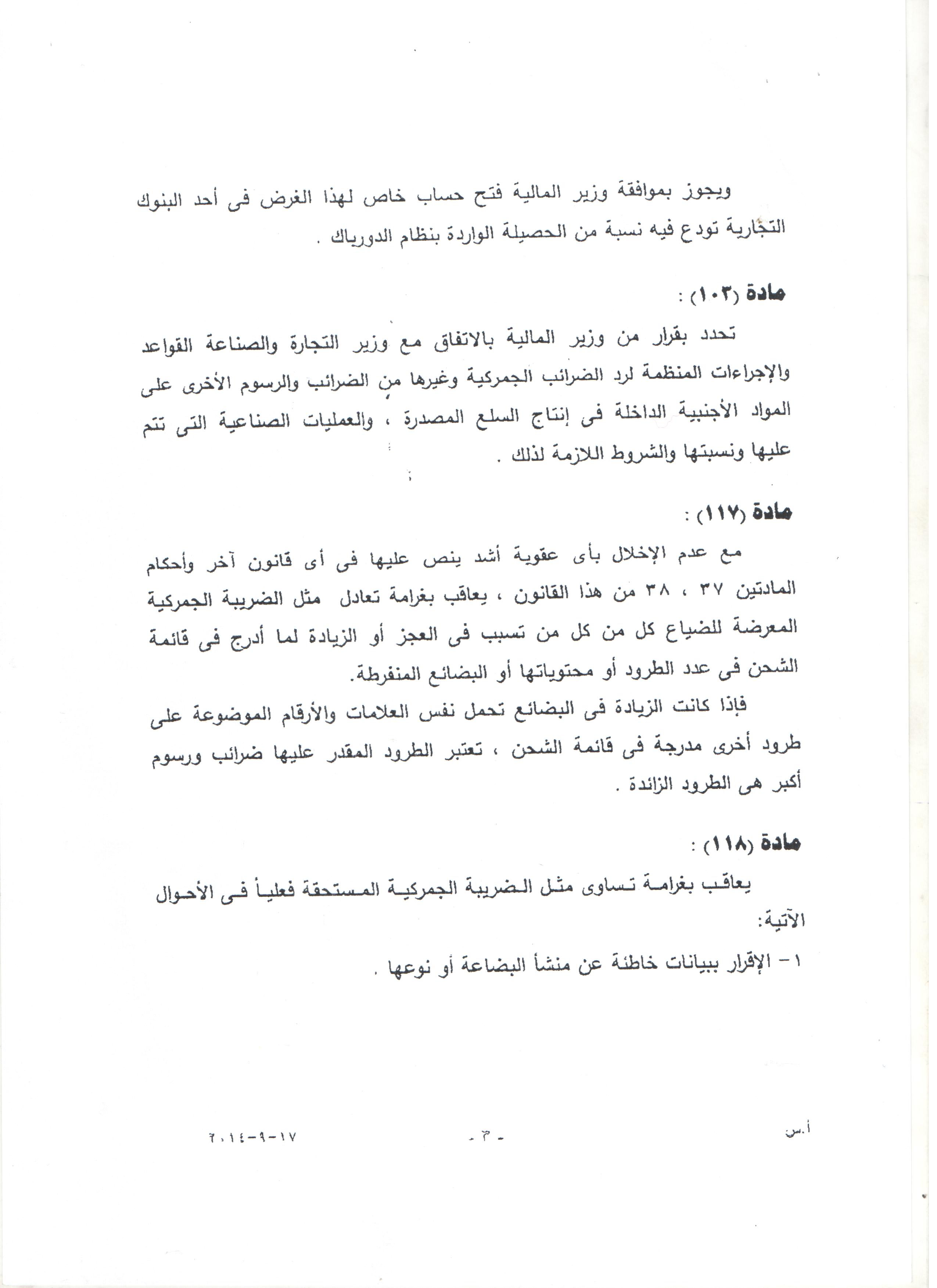وتنص المادة 103 على أنه “تحدد بقرار من وزير المالية بإتفاق مع وزير التجارة والصناعة القواعد والإجراءات المنظمة لرد الضرائب الجمركية وغيرها من الضرائب والرسوم الأخرى على المواد الأجنبية الداخلة في إنتاج السلع المصدرة ،والعمليات الصناعية التي تتم عليها ونسبتها والشروط اللازمة لذلك .