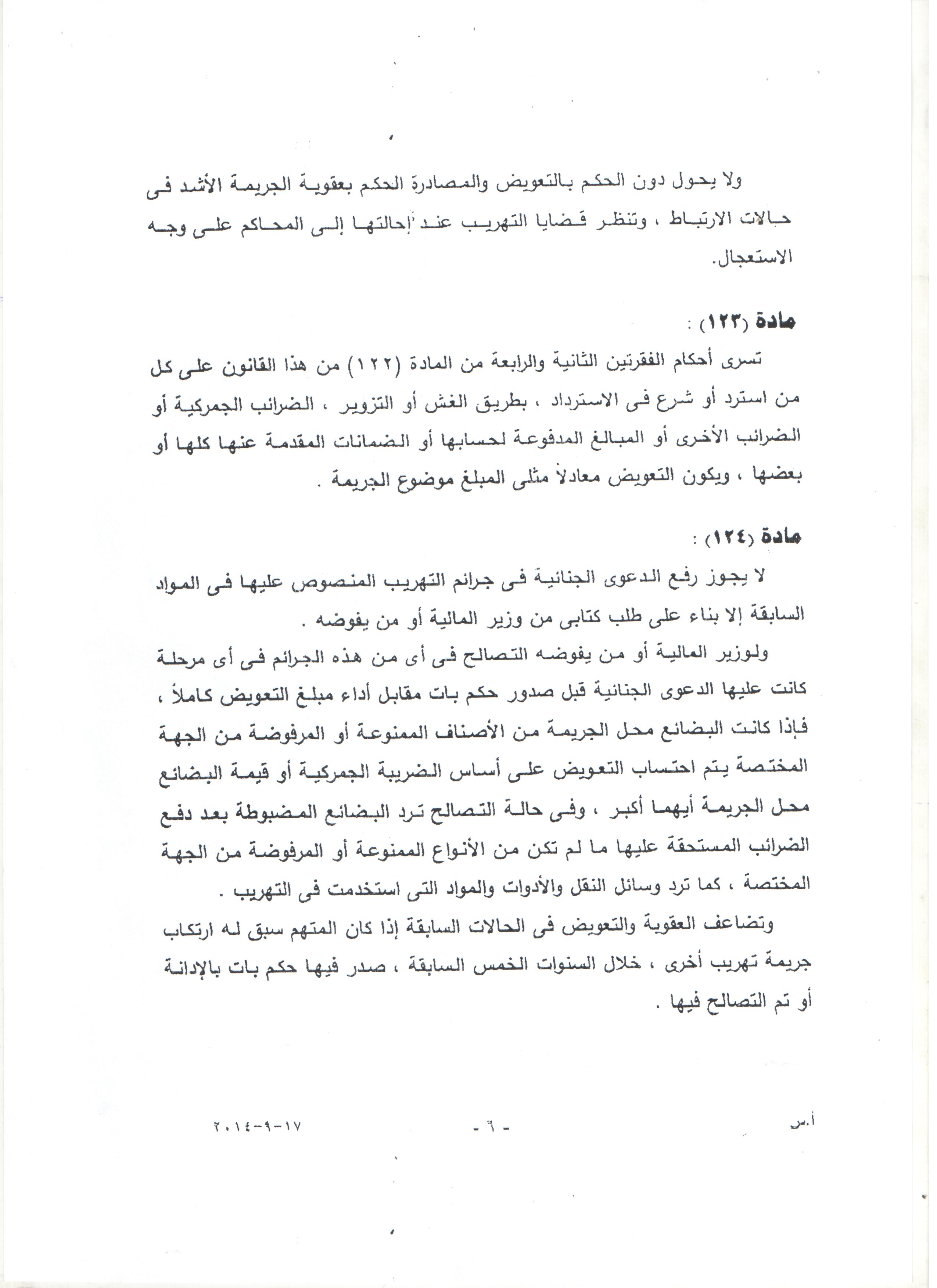“المادة 124″ لا يجوز رفع الدعوى الجنائية في جرائم التهريب المنصوص عليها في المواد السابقة إلا بناءً على طلب كتابي من وزير المالية أو من يفوضه .