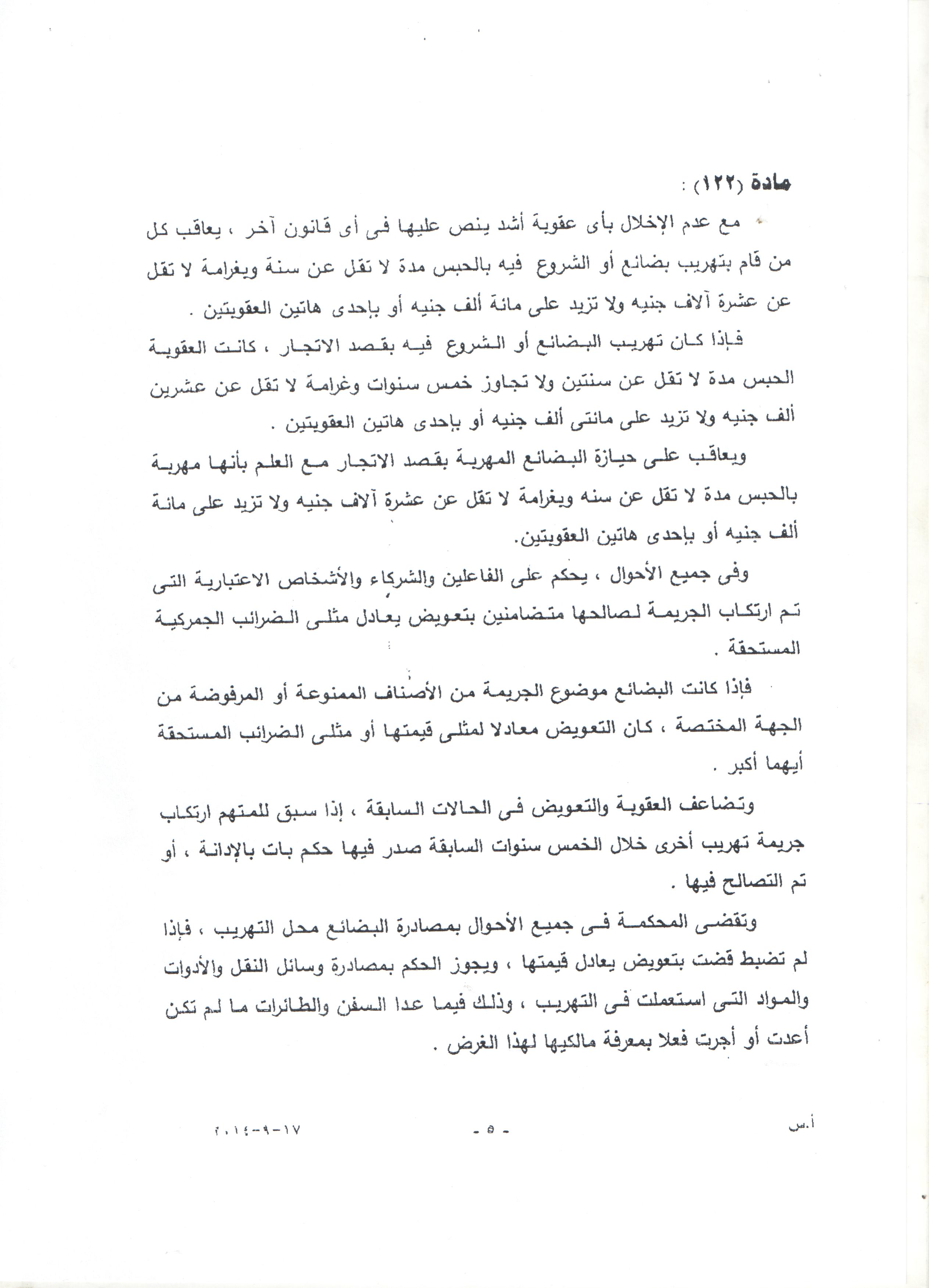 ونصت تعديلات القانون على إستبدال مادة العقوبات ” 122″ بأنه “مع عدم الإخلال بأي عقوبة أشد ينص عليها في أي قانون أخر يعاقب كل من قام بتهريب بضائع أو الشروع فيه بالحبس مدة لا تقل عن سنة وغرامة لا تقل عن 10 ألاف جنيه ولا تزيد عن 100 ألف جنيه أو بإحدى هاتين العقوبتين” .
