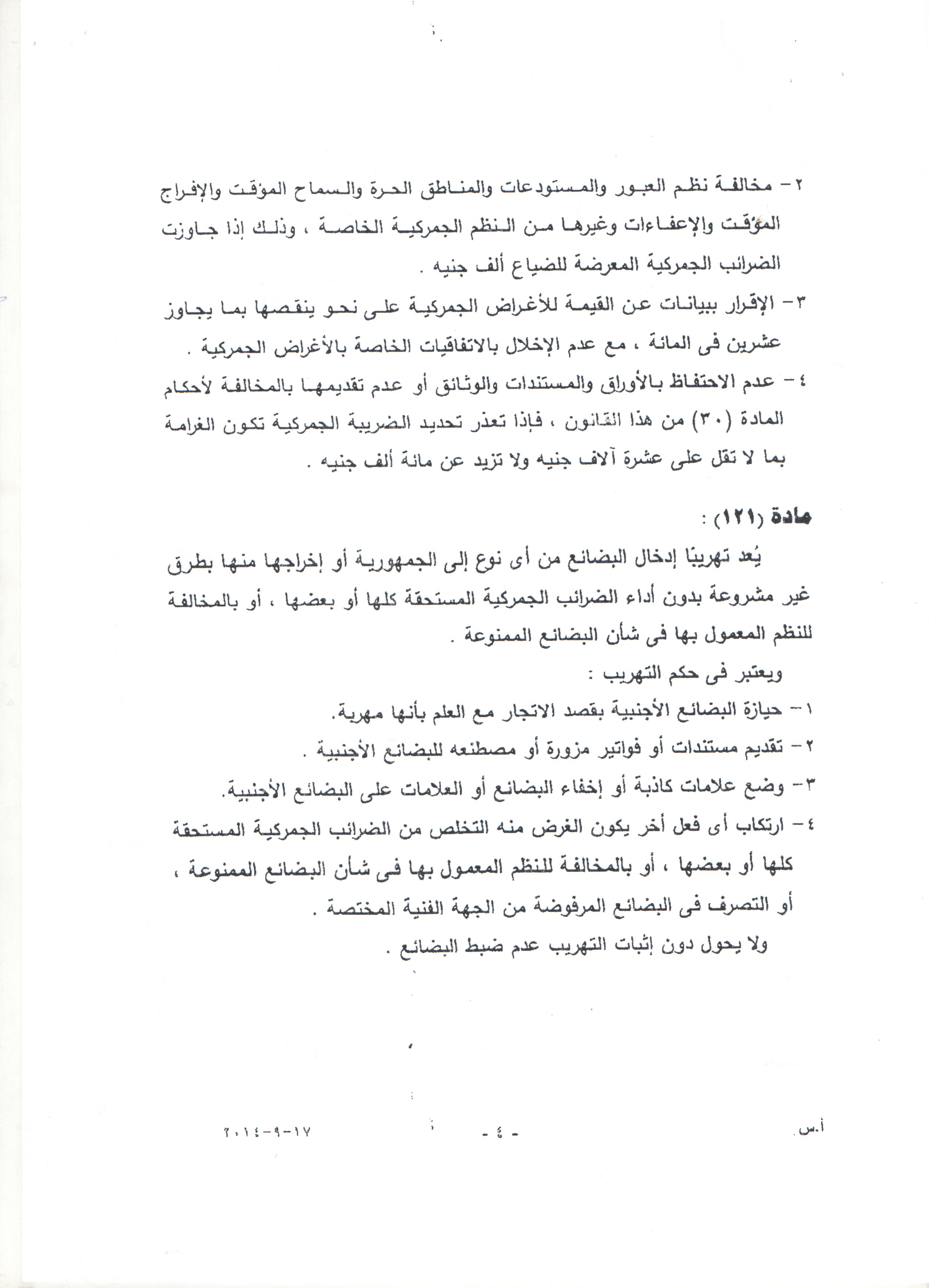مادة 121 : يعد تهريباً إدخال البضائع من أي نوع إلى الجمهورية أو إخراجها منها بطرق غير مشروعة بدون أداء الضرائب الجمركية المستحقة كلها او بعضها ، أو بالمخالفة للنظم المعمول بها في شأن البضائع الممنوعة .