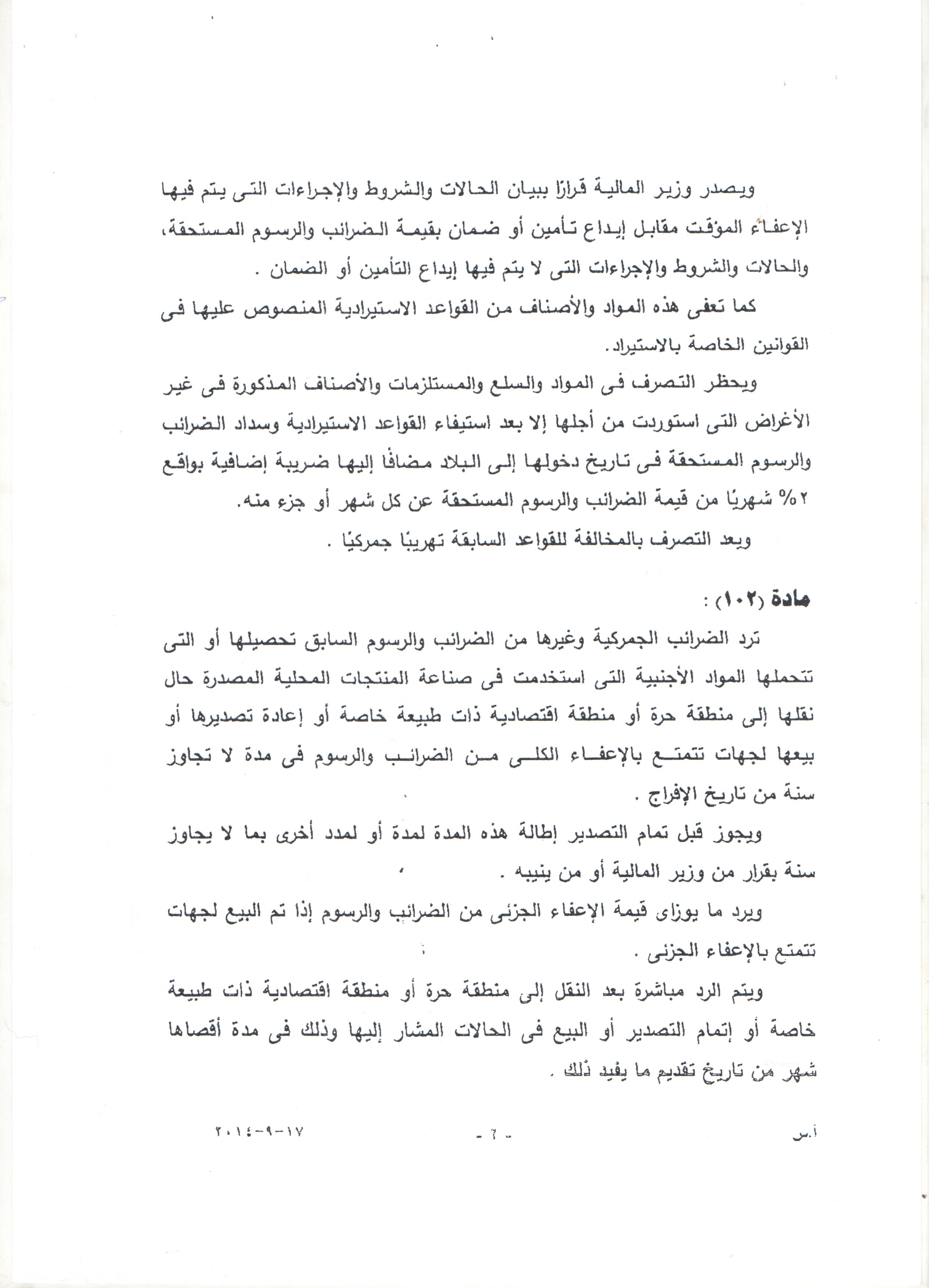 ونصت المادة 102 المعدلة على أنه “ترد الضرائب الجمركية وغيرها من الضرائب والرسوم السابق تحصيلها او التي تتحملها المواد الأجنبية التي أستخدمت في صناعة المنتجات المحلية المصدرة حال نقلها إلى منطقة حرة أو منطقة اقتصادية ذات طبيعة خاصة أو إعادة تصديرها أو بيعها لجهات تتمتع بالإعفاء الكلي من الضرائب والرسوم في مدة لا تجاوز سنة من تاريخ الإفراج .