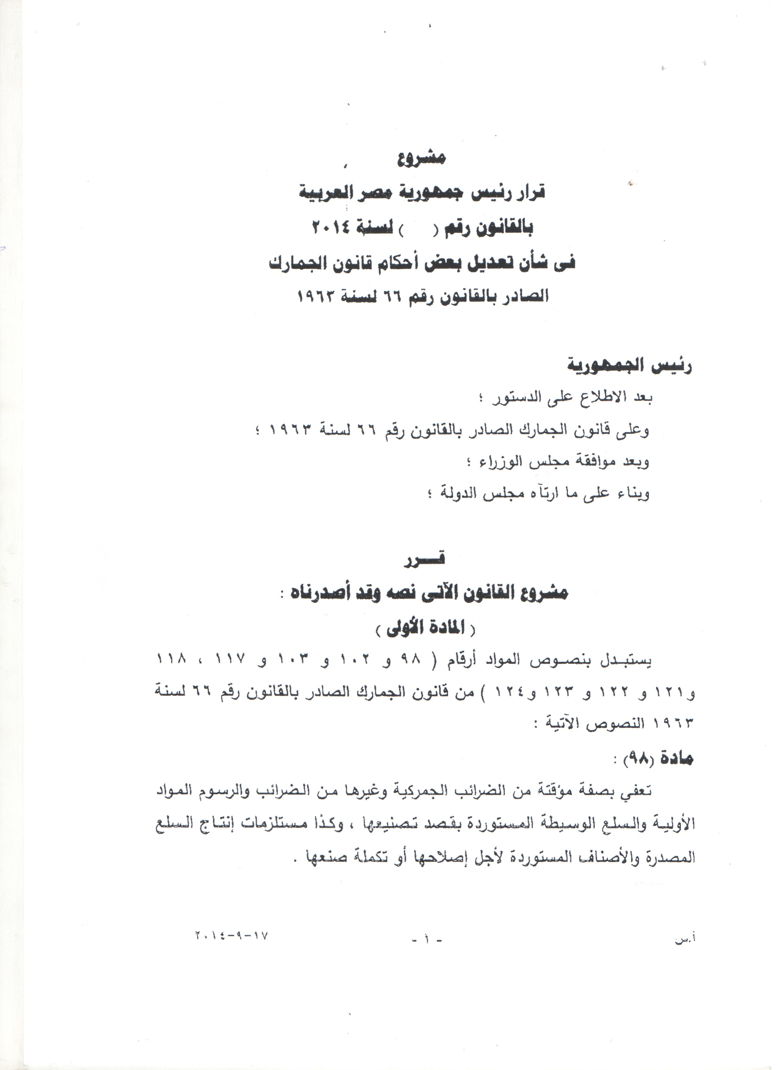 حصلت “البورصة” على مشروع قرار رئيس الجمهورية بشأن تعديل بعض أحكام قانون الجمارك الصادر بالقانون رقم 66 لسنة 1963 والمرتقب إقراره خلال أيام قليله ، حيث تم تعديل 9 بنود فقط من القانون القديم .
