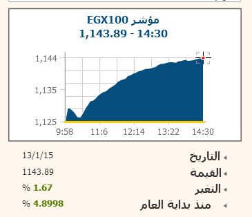 وارتفع المؤشر الرئيسى لـ البورصة المصرية EGX30 بنسبة 2.19% بنهاية تعاملات اليوم، ليصل الى مستوى 9308.98 نقطة، باختراق مستوى 9300، وصعد مؤشرEGX70 للأسهم المتوسطة بنسبة 1.24% ليصل الى مستوى 583.53 نقطة، كما ارتفع مؤشر EGX100 الأوسع نطاقا بنسبة 1.67% ليصل لمستوى 1143.89 نقطة .