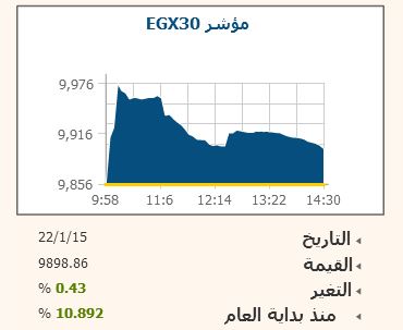 ارتفع المؤشر الرئيسى لـ البورصة المصرية EGX30 بنسبة 0.43% بنهاية تداولات جلسة اليوم الخميس، وسط جلسة تصاعدية من البداية ليخترق مستوى 9900 نقطة، ويصل لأعلى مستوى له منذ 7 سنوات بعد سقوط البورصة عام 2008 على أثر الأزمة الاقتصادية العالمية، ويغلق فى النهاية عند مستوى 9856.3 نقطة مكتسباً 42.56 نقطة، بينما تراجع مؤشر EGX70 للأسهم المتوسطة بنسبة 0.23% مغلقا عند مستوى 569.97 نقطة، وتراجع مؤشر EGX100 الأوسع نطاقا بنسبة 0.52% مستقرا عند مستوى 1140.58 نقطة.