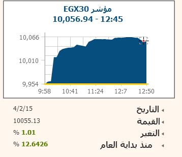 ارتفع المؤشر الرئيسى لـ البورصة المصرية EGX30 بنسبة 1.01% بمنتصف تداولات جلسة اليوم الاربعاء، ليصل إلى مستوى 10055.13 نقطة، ليعلن نأكيده على الاستمرار أعلى حاجز 10 آلاف نقطة، وصعد مؤشر EGX70 للأسهم المتوسطة بنسبة 1.26% وصولا إلى مستوى 597.12 نقطة، ليقترب من أختراق مستوى 600 نقطة، وارتفع مؤشر EGX100 الأوسع نطاقا بنسبة 1.57% ليستقر عند مستوى 1181.26 نقطة .