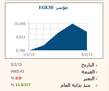 ارتفع المؤشر الرئيسى للبورصة المصرية EGX30 بنسبة 1.24% خلال تعاملات الأسبوع الماضى، ليغلق عند مستوى 9965.43 نقطة، بعد اختراقه لمستوى 10 آلاف نقطة بجلسة الاربعاء الماضى، وصعد مؤشر EGX70 للأسهم المتوسطة بنسبة 3.75% ليستقر عند مستوى 598.19 نقطة، وارتفع مؤشر EGX100 الأوسع نطاقا بنسبة 2.97%، ليصل إلى مستوى 1179.09 نقطة .