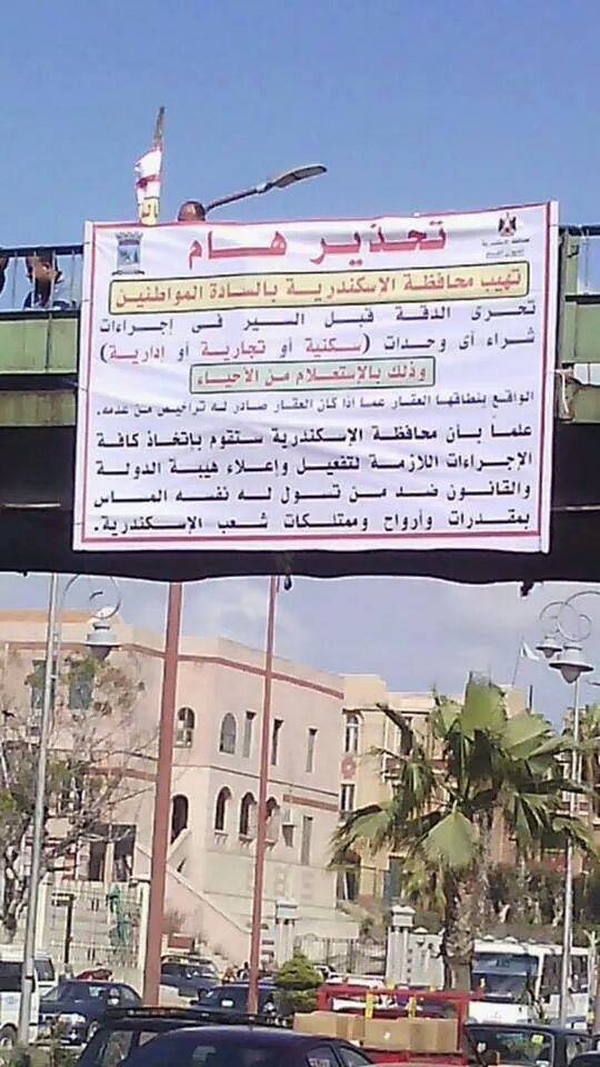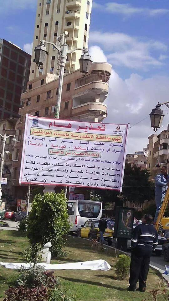 نشرت محافظة الأسكندرية اليوم تحذير للمواطنين بكافة شوارع المحافظة بضرورة تحري الدقة قبل القيام بشراء أي وحدات سكنيه أو تجارية والتأكد من صحة تراخيصها من خلال الحي التابعه له .