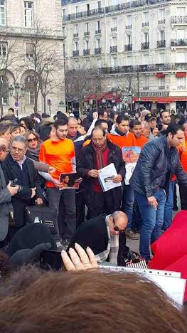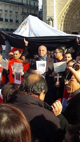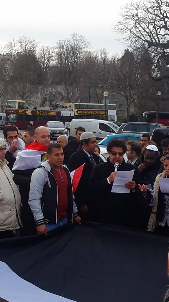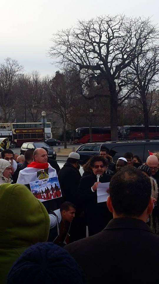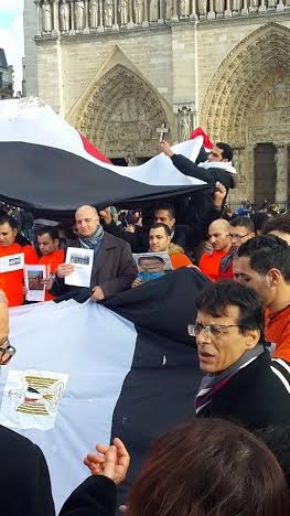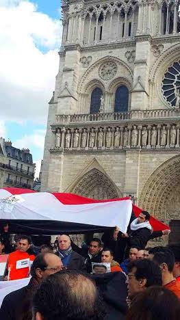 بدأت الوقفة من أمام كنيسة ” نوترام دي باريس “، ورفع خلالها المشاركون من أبناء الجالية ووفد نقابة الفلاحين والمنتجين الزراعيين، الأعلام المصرية، واللافتات التى تعلن تأييد المصريين للقيادة السياسية، معبرين عن دعمهم الكامل لوطنهم الحبيب مصر فى حربه ضد الإرهاب، كما ردد المشاركون فى الوقفة، الهتافات المؤيدة للنظام والجيش والشرطة، وبعدما قدم المشاركون فيها واجب العزاء فى شهداء الوطن، الذين اغتالتهم أياد الإرهاب الغاشم وتنظيمهم الإرهابى “داعش”، انطلقت المسيرة المصرية من أمام الكنيسة إلى برج إيفل، حيث الوقفة التضامنية التى تم الاتفاق عليها من قبل.