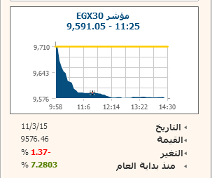 تراجع المؤشر الرئيسي “EGX30” بنسبة 1.37% ليغلق عند مستوى 9576.46 نقطة، وانخفض مؤشر الأسهم الصغيرة والمتوسطة “EGX70” بنسبة 1.16% ليصل إلى مستوى 556.89 نقطة، كما هبط المؤشر الأوسع نطاقاً EGX100 ليغلق عند مستوى 1120.39 نقطة بانخفاض نسبته 1.05% .