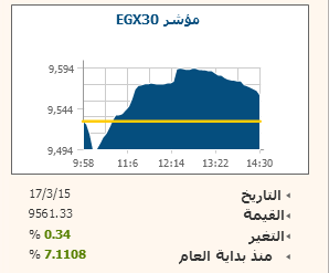 ارتفع المؤشر الرئيسى للبورصة المصرية EGX30 بنسبة 0.34% بنهاية تداولات جلسة اليوم الثلاثاء ليغلق عند مستوى 9561.33 نقطة، وصعد مؤشر EGX70 للأسهم المتوسطة بنسبة طفيفة بلغت 0.03% مغلقا عند مستوى 549.53 نقطة، كما ارتفع مؤشر EGX100 الأوسع نطاقا بنسبة 0.2% ليستقر عند مستوى 1110.5 نقطة.