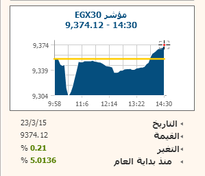 ارتفع المؤشر الرئيسى للبورصة المصرية EGX30 بنسبة 0.21% رغم الخسائر المحققة طوال جلسة اليوم الاثنين ليرتفع بأخر نصف ساعة، ويغلق عند مستوى 9374.12 نقطة، وقلص مؤشر EGX70 للأسهم المتوسطة خسائره الصباحية ليتراجع بنسبة 0.2% مغلقا عند مستوى 527.15 نقطة، فى حين سجل مؤشر EGX100 الأوسع نطاقا تراجعاً بنسبة 0.1% ليستقر عند مستوى 1077.15 نقطة.