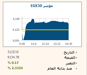 ارتفع المؤشر الرئيسى للبورصة المصرية EGX30 بنسبة 0.17% ليغلق بنهاية تداولات اليوم الثلاثاء عند مستوى 9134.78 نقطة، بينما فقد مؤشر EGX70 للأسهم المتوسطة والصغيرة كل مكاسبه الصباحية ليغلق متراجعاً 0.02% بمستوى 517.61 نقطة، وصعد مؤشر EGX100 الأوسع نطاقا بنسبة 0.11% وصولا إلى مستوى 1045.63 نقطة.
