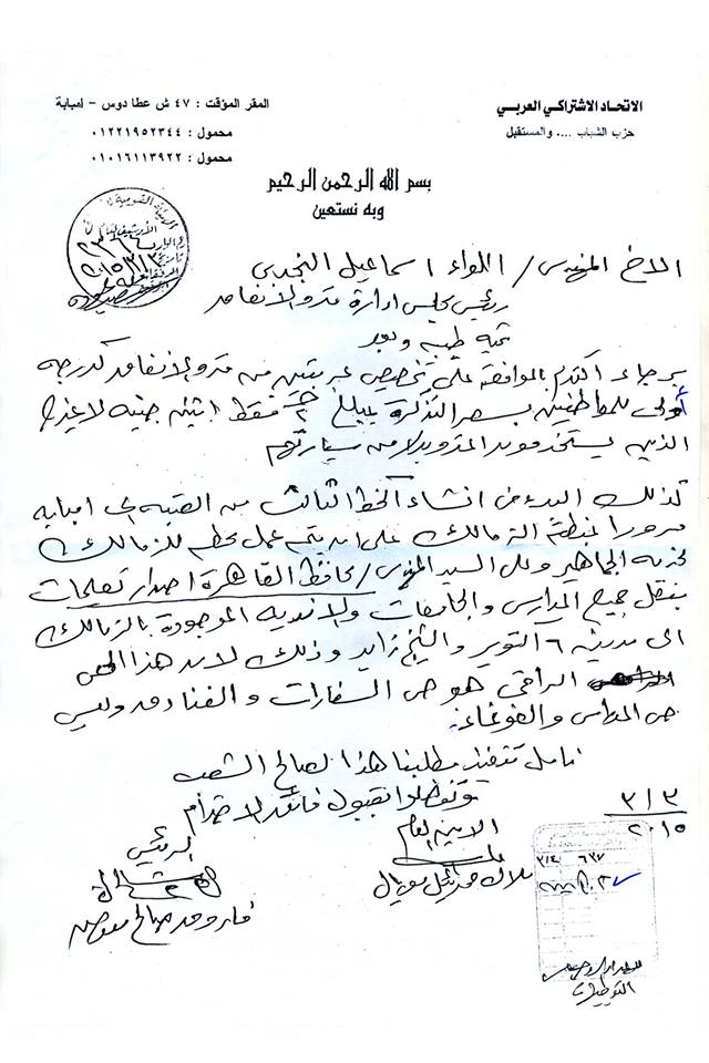 وقام بتوقيع الخطاب رئيس الحزب فاروق صالح و الامين العام ملاك جبرائيل بتاريخ 3 مارس الماضى
