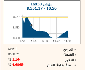تابع المؤشر الرئيسى للبورصة المصرية EGX30 سلسلة تراجعاته لينخفض بنسبة 1.16% بنهاية تداولات جلسة اليوم الاثنين ليغلق عند مستوى 8508.24 نقطة، كما هبط مؤشرEGX70 للأسهم المتوسطة بنسبة 1.4% ليغلق عند مستوى 483.08 نقطة، وانخفض مؤشر EGX100 الأوسع نطاقا بنسبة 1.17% ليستقر عند مستوى 985.59 نقطة.
