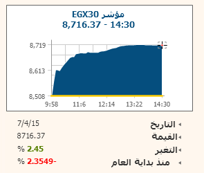 تعافى المؤشر الرئيسى للبورصة المصرية EGX30 فى ختام تعاملات جلسة اليوم الثلاثاء ليصعد 2.45% بنهاية ويغلق عند مستوى 8716.37 نقطة، وارتفع مؤشرEGX70 للأسهم المتوسطة بنسبة 2.62% ليغلق عند مستوى 495.73 نقطة، وصعد مؤشر EGX100 الأوسع نطاقا بنسبة 2.12% ليستقر عند مستوى 1006.51 نقطة.