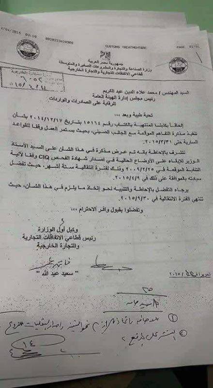 كانت وزارة الصناعة و التجارة اجرت بعض التعديلات على اتفاقية CIQ و هو أن يقوم المستورد أو التاجر الذى يقوم بشراء أى سلع صينية بتسجيل نفسه فى الهيئة العامة للرقابة على الصادرات والواردات أولاً، بالإضافة إلى تقديم قائمة بالأصناف التى يرغب فى استيرادها، على أن يتم إعطاؤه رقم مواصفة لكل صنف على حدة.