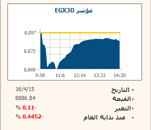 قلص المؤشر الرئيسى للبورصة المصرية EGX30 خسائره الصباحية لينهى تداولات الخميس على تراجع بنسبة 0.1%، ليغلق عند مستوى 8887.42 نقطة، بينما أغلق مؤشر EGX70 للأسهم المتوسطة مرتفعاً 0.75% بعد تراجعه بأول ساعتين من الجلسة ليستقر عند مستوى 494.5 نقطة، كما صعد مؤشر EGX100 الأوسع نطاقا بنسبة 0.33% مغلقا عند مستوى 1008.42 نقطة.