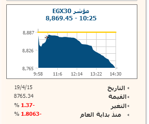 تراجع المؤشر الرئيسى للبورصة المصرية EGX30 بنسبة 1.37% بنهاية تداولات الأحد ليعمق من خسائره الصباحية المحققة ويغلق عند مستوى 8765.34 نقطة، بينما أغلق مؤشر EGX70 للأسهم المتوسطة مرتفعاً 0.08% ليقلص من مكاسبه المحققة طوال الجلسة بأحر ساعة ويستقر عند مستوى 494.89 نقطة، بينما تحول مؤشر EGX100 الأوسع نطاقا للخسارة بنسبة 0.21% بأخر نصف ساعة مغلقا عند مستوى 1006.32 نقطة.