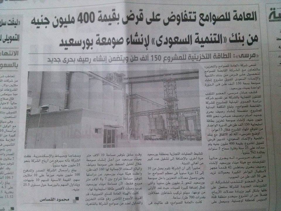 أكدت شركة “العامة للصوامع والتخزين” اليوم ما نشرته جريدة البورصة بخصوص التفاوض على قرض بقيمة 400 مليون جنيه من بنك التنمية السعودي لإنشاء صومعة ببورسعيد.