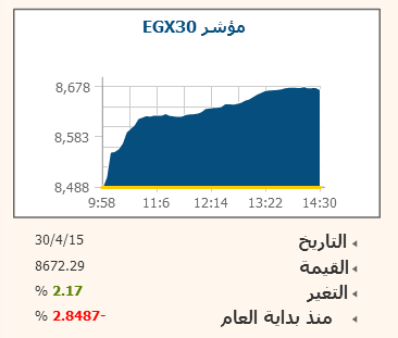 ارتفع المؤشر الرئيسى للبورصة المصرية EGX30 بنسبة 2.17% بنهاية تداولات جلسة اليوم الخميس ليغلق عند مستوى 8672.3 نقطة، وصعد مؤشر EGX70 للأسهم المتوسطة بنسبة 2.01% مغلقا عند مستوى 475.44 نقطة، كما ارتفع مؤشر EGX100 الأوسع نطاقا بنسبة 1.8% ليستقر عند مستوى 971.75 نقطة.