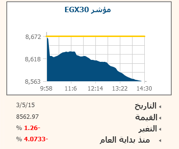تراجع المؤشر الرئيسى للبورصة المصرية EGX30 بنسبة 1.26% بنهاية تداولات جلسة اليوم الأحد ليغلق عند مستوى 8562.9 نقطة، وواصل مؤشر EGX70 للأسهم المتوسطة تراجعه بنسبة 2.2% مغلقا عند مستوى 464.9 نقطة، كما هبط مؤشر EGX100 الأوسع نطاقا بنسبة 1.54% ليستقر عند مستوى 956.83 نقطة.