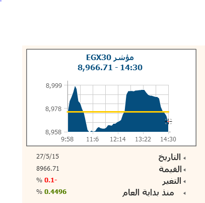 تراجع المؤشر الرئيسى للبورصة المصرية EGX30 بختام تعاملات اليوم وسط حالة من التذبذب اصابت الجلسة منذ البداية ليهبط 0.01% ويستقر بمستوى 8966.7 نقطة.