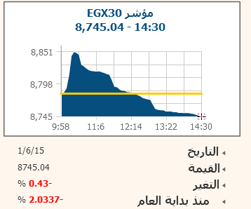 تراجع المؤشر الرئيسى للبورصة المصرية EGX30 بختام تعاملات اليوم وسط حالة من التذبذب اصابت الجلسة ليهبط 0.43% خاسراً كل مكاسبه الصباحية ويستقر بمستوى 8745 نقطة.